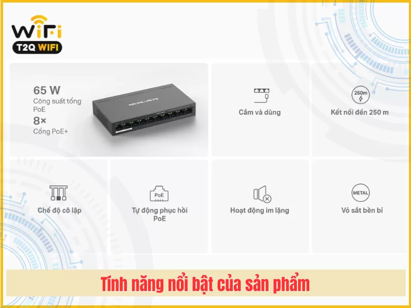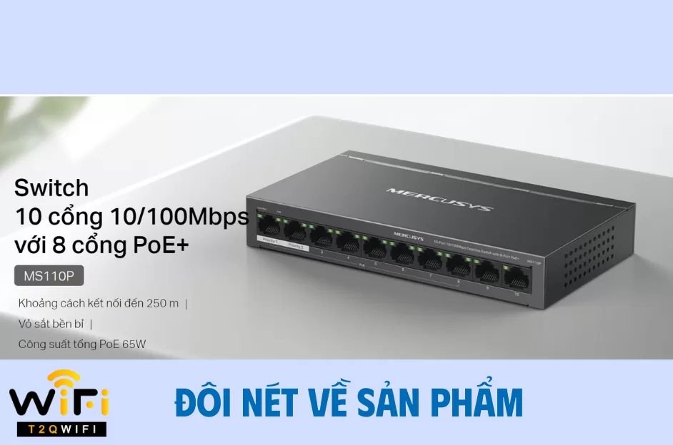 TP-Link Mercusys MS110P là giải pháp mạng toàn diện cho doanh nghiệp nhỏ và hệ thông camera. Mercusys MS110P là switch PoE 10 cổng (10/100Mbps), trong đó có 8 cổng hỗ trợ PoE+ với tổng công suất 65W, lý tưởng cho việc triển khai hệ thống camera IP, điện thoại VoIP, điểm truy cập Wi-Fi và nhiều thiết bị mạng khác. Thiết bị này mang đến sự linh hoạt, tiết kiệm chi phí và dễ dàng triển khai cho các văn phòng, cửa hàng, ký túc xá và doanh nghiệp nhỏ.Hãy cùng T2QWIFI tìm hiểu sản phẩm qua bài viết này nhé !!!